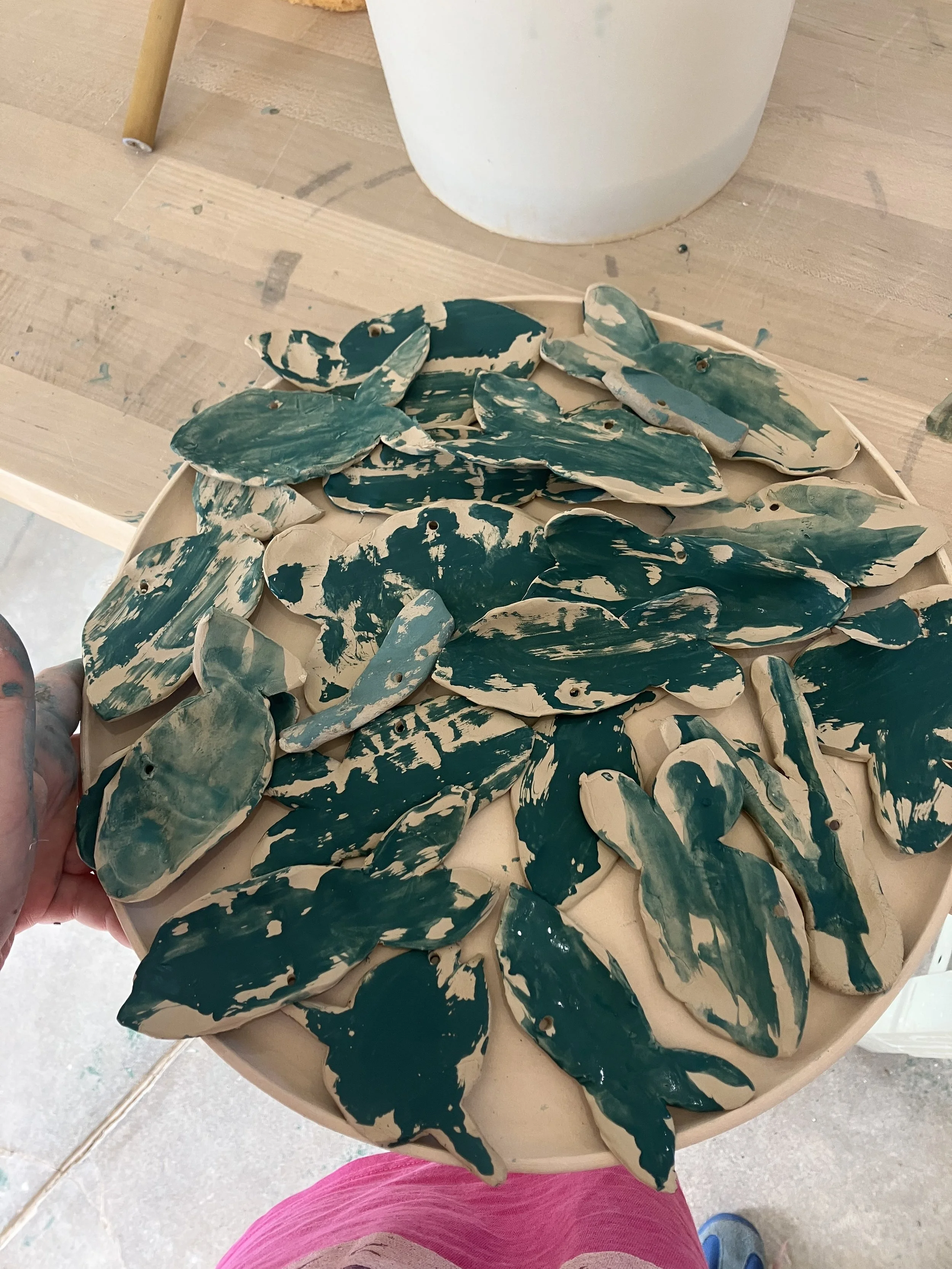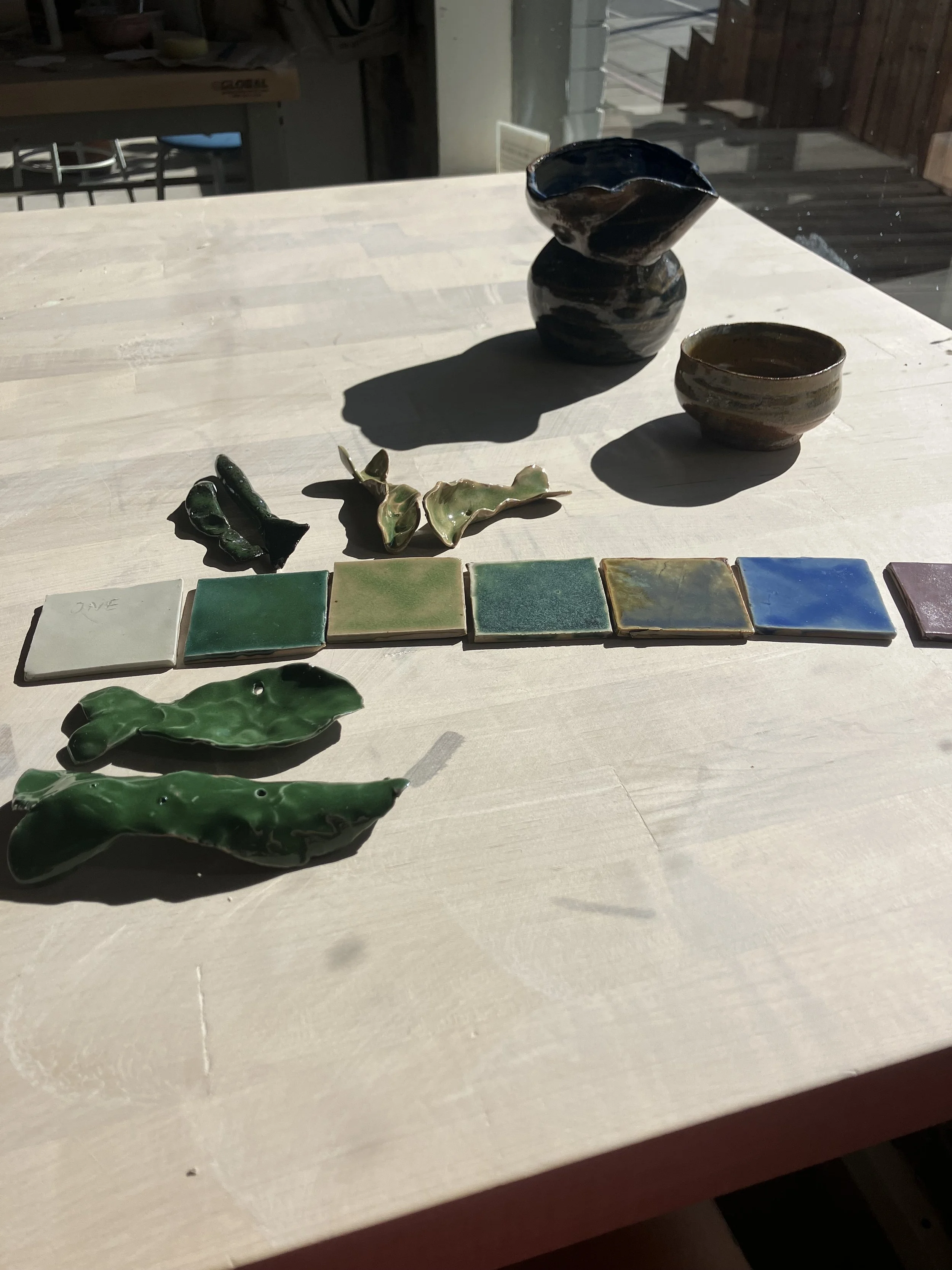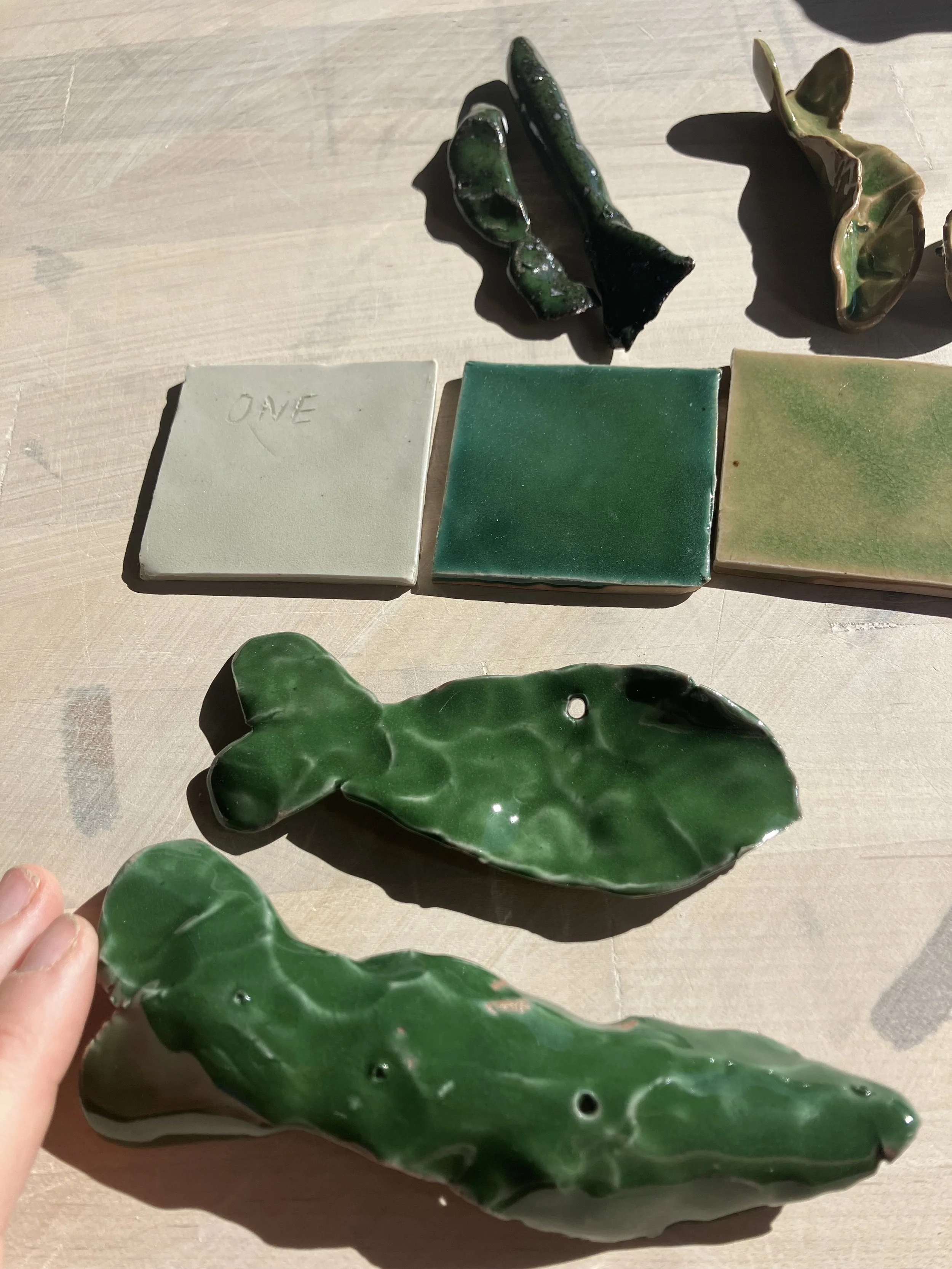 Dana’s fish in sun. Test tiles came from the kiln and I love them. Pelegreeno and blue is most fish ready.